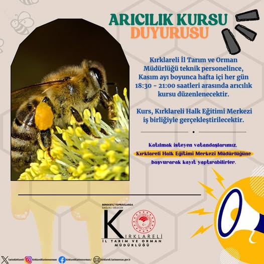 Kırklareli Tarım Orman İl Müdürlüğü ve Halk Eğitim Müdürlüğü iş birliğince Kasım ayı içinde arıcılık kursu düzenlenecektir.